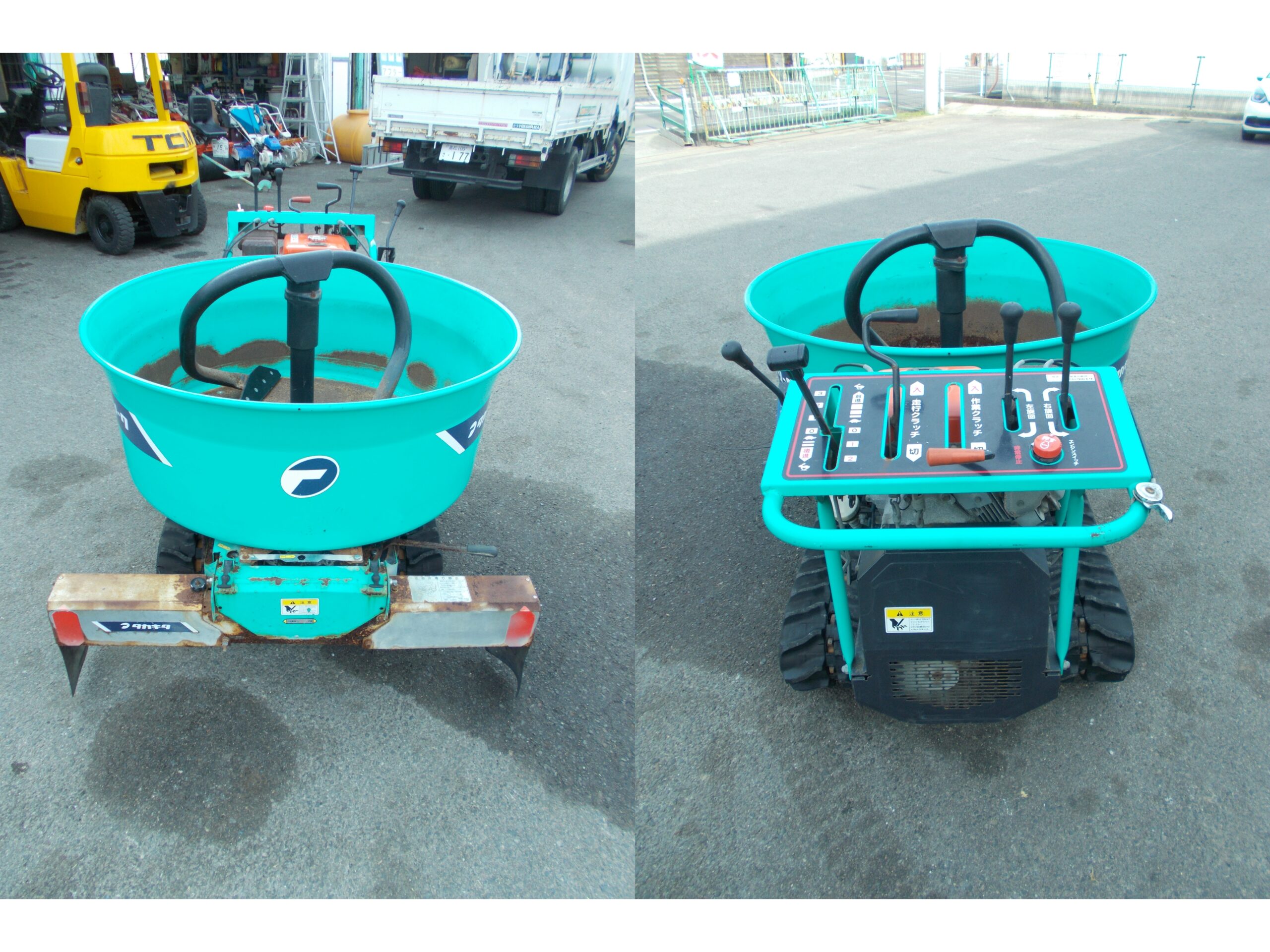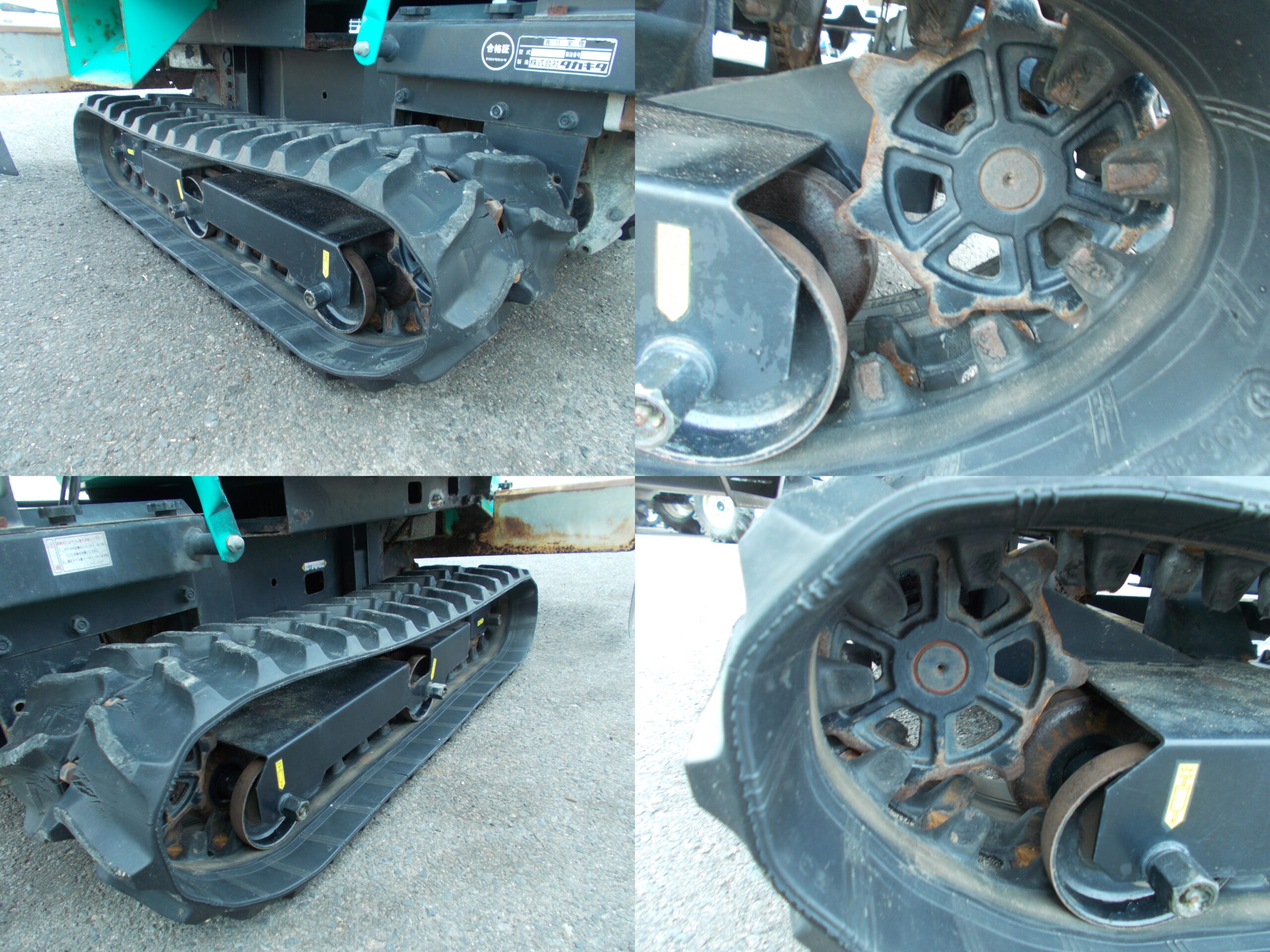 【査定の状態】※排出口の仕切りに錆あり ※散布側の下部に錆あり ※散布調節ハンドルが固着 ※左右クローラーにヒビとキレツあり